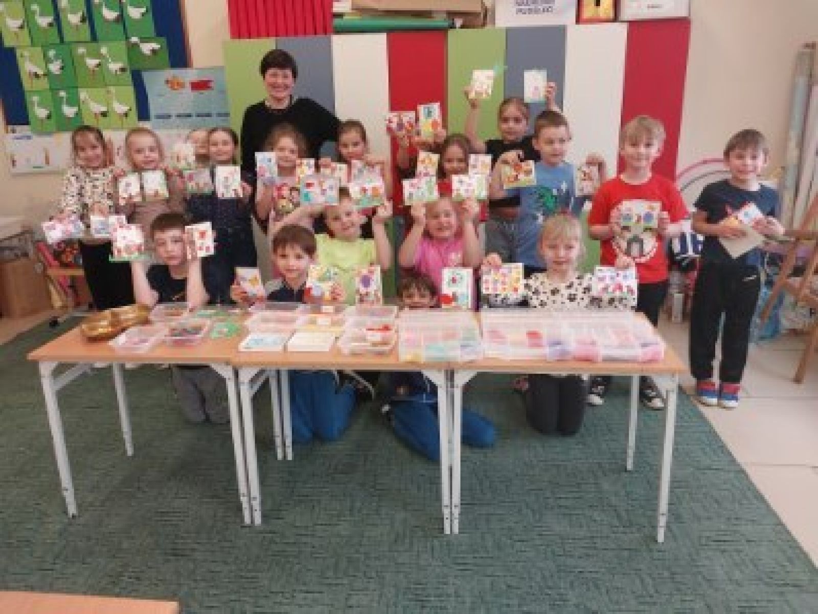 • Dzieci na wspólnym zdjęciu z wykonanymi kartkami.
