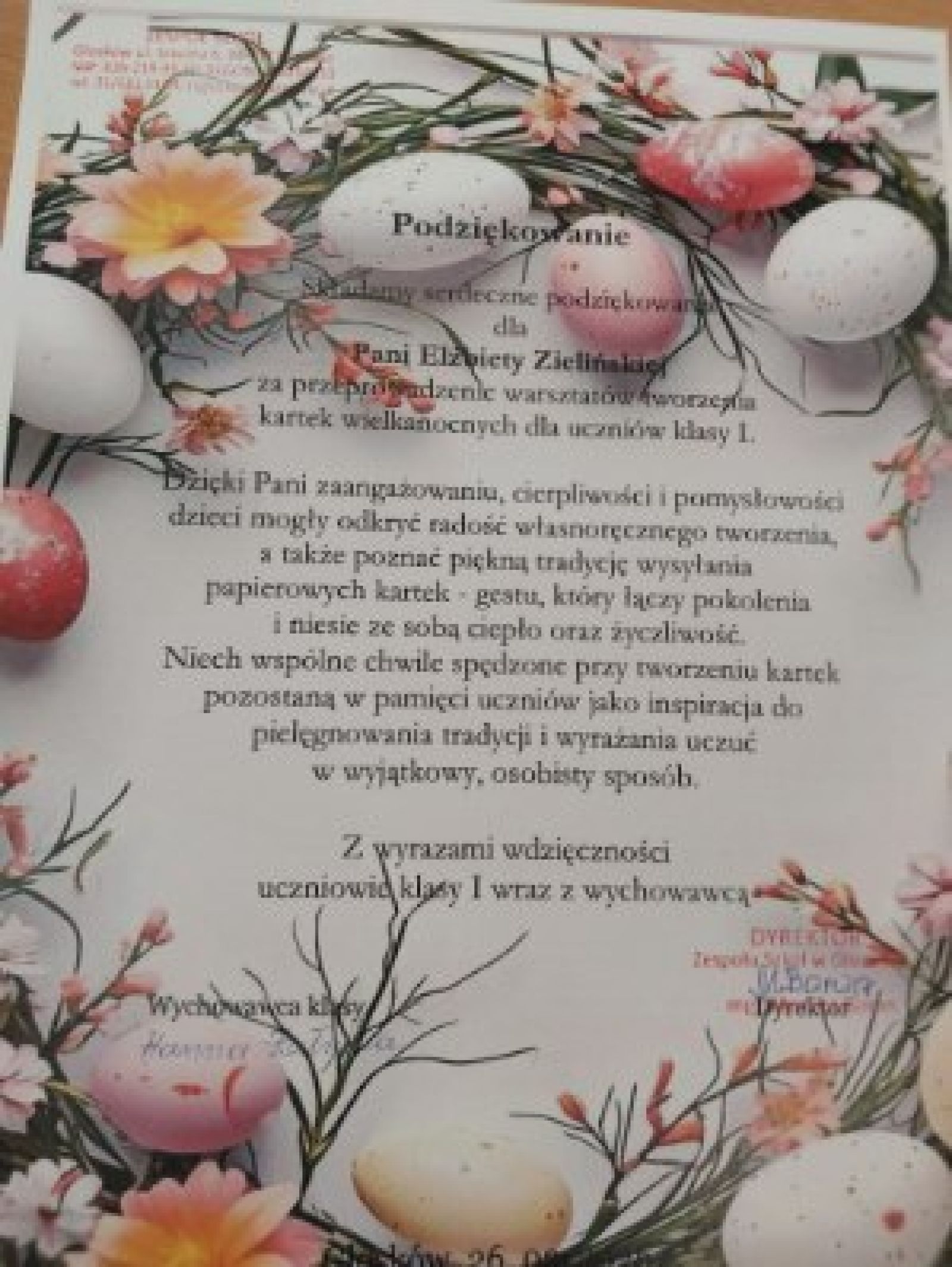 Dnia 26 marca w klasie pierwszej odbyły się warsztaty plastyczne poświęcone tworzeniu kartek wielkanocnych. Zajęcia poprowadziła pani Elżbieta Zielińska, terapeuta zajęciowy, a zarazem mama jednej z uczennic klasy pierwszej.Podczas warsztatów dzieci tworzyły kartki z gotowych elementów związanych ze świętami wielkanocnymi, przygotowanych wcześniej przez panią Elę. Uczniowie wybierali spośród kolorowych pisanek, zajączków, kurczaczków, kwiatów i innych ozdób, komponując własne, niepowtarzalne prace. Zajęcia przebiegały w radosnej i twórczej atmosferze. Dzieci z zaangażowaniem dobierały elementy, rozwijając przy tym wyobraźnię, poczucie estetyki oraz zdolności manualne. Podobne warsztaty odbyły się również przed Bożym Narodzeniem, kiedy uczniowie wykonywali kartki świąteczne o tematyce zimowej. Dzięki takim zajęciom dzieci mają możliwość rozwijania kreatywności, poznawania tradycji świątecznych oraz wspólnego przeżywania wyjątkowych chwil w klasowej społeczności. W dobie dynamicznego rozwoju cyfryzacji tradycyjne, papierowe kartki świąteczne coraz rzadziej są wysyłane. Tym bardziej warto podtrzymywać  ten piękny zwyczaj, który uczy wrażliwości, dbałości o szczegóły i pozwala w wyjątkowy sposób przekazać świąteczne życzenia. Na zakończenie warsztatów wykonano pamiątkowe zdjęcie, a uczniowie z dumą prezentowali swoje własnoręcznie wykonane kartki wielkanocne.