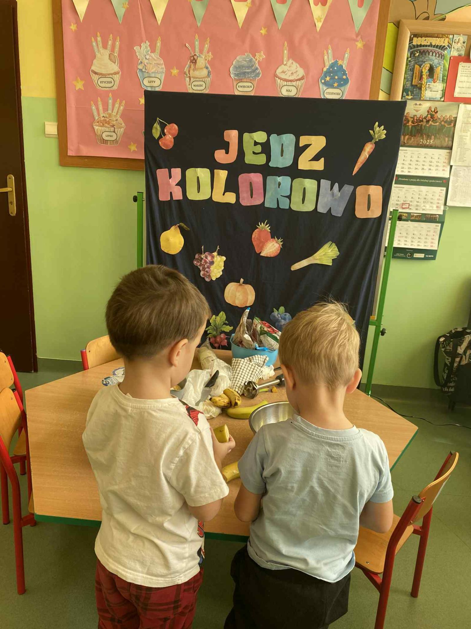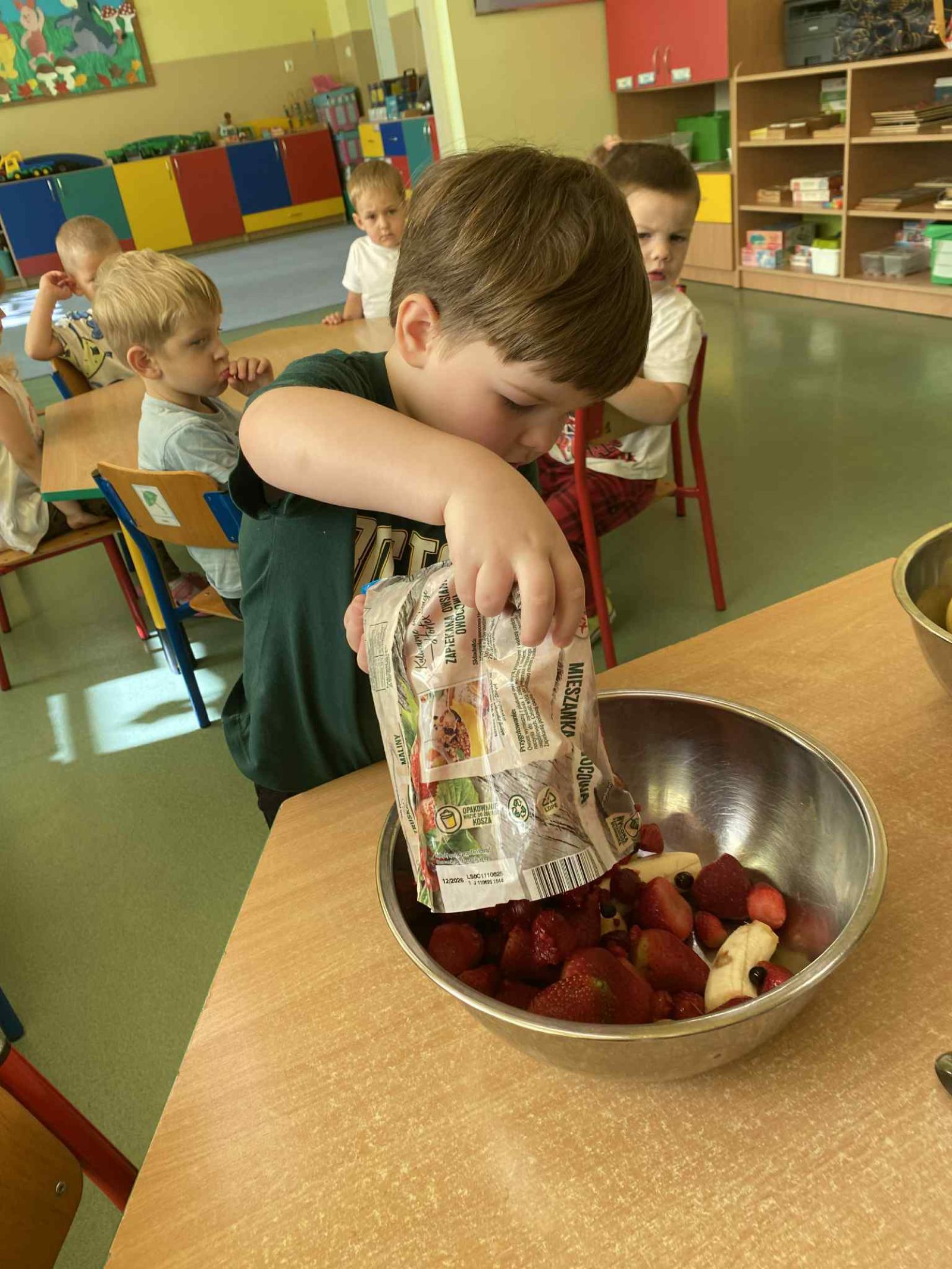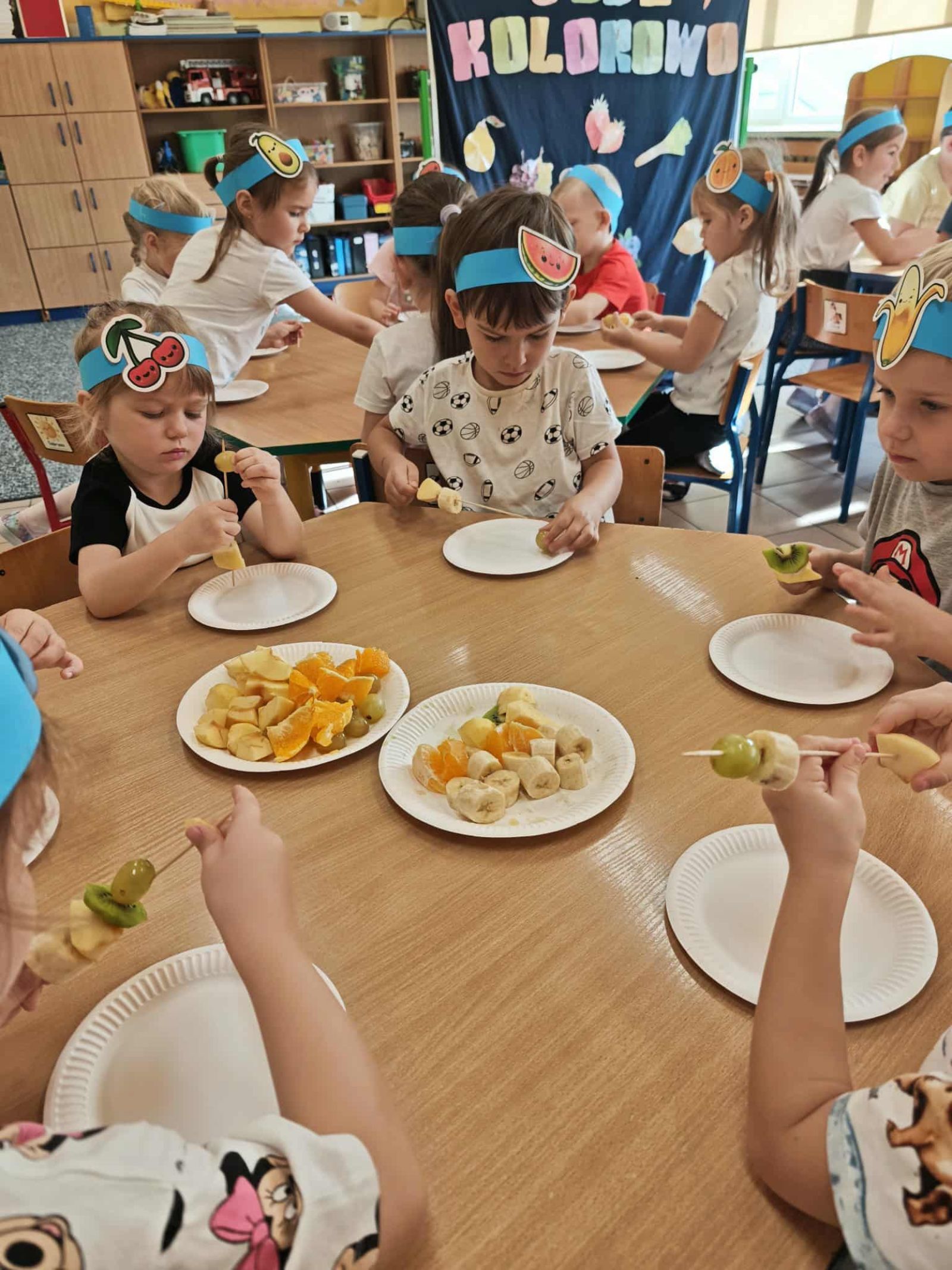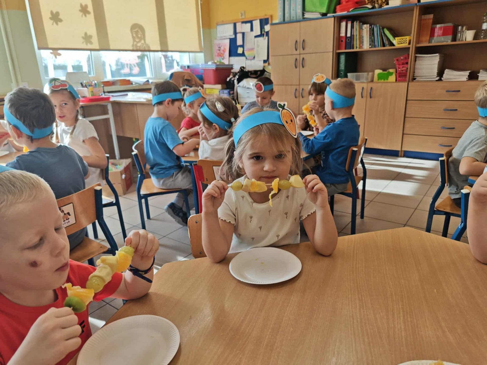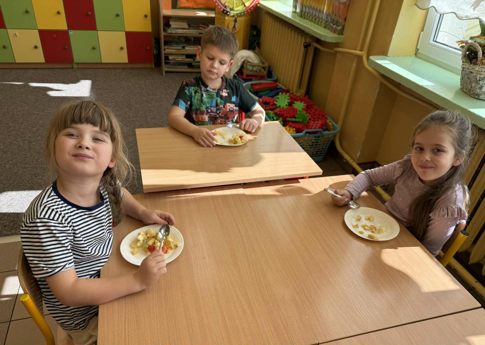 W tym tygodniu w naszym przedszkolu obchodziliśmy Światowy Dzień Owoców i Warzyw. Z tej okazji dzieci uczestniczyły w zajęciach, podczas których poznały zasady zdrowego odżywiania. Przedszkolaki dowiedziały się, jak wygląda piramida zdrowia, które produkty są zdrowe, a których należy unikać. Podczas wspólnej zabawy dzieci odkrywały, jakie witaminy i wartości odżywcze kryją się w owocach i warzywach oraz jak ważną rolę odgrywają one w codziennym żywieniu człowieka. Poznały również budowę jabłka i nazwy jego części. Nie zabrakło także praktycznej części zajęć. Każda grupa przygotowała własną zdrową przekąskę: maluszki – kolorowe koktajle, starszaki – apetyczne szaszłyki owocowe, zerówka – samodzielnie wykonaną sałatkę owocową.